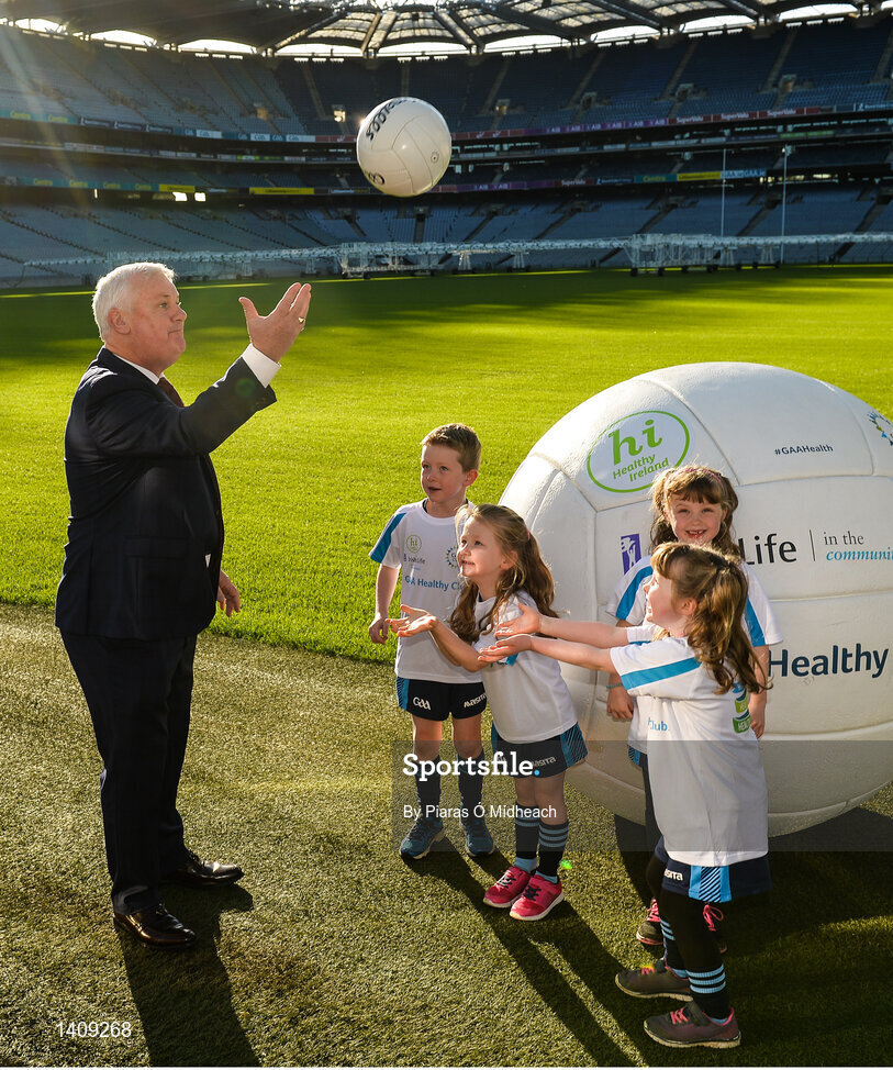 4 November 2017; In attendance at the GAA Healthy Clubs Recognition Event, supported by Irish Life, which saw 58 GAA clubs recognised as the first official ‘Healthy Clubs’ on the island of Ireland is Uachtarán Chumann Lúthchleas Gael Aogán Ó Fearghail with, from left, Conor McDonald, age 6, Méabh McDonald, age 4, Alannah Lalor, age 5, and Aoibhe Lalor age 7, all from the St Colmcilles Healthy Club in Meath. The GAA’s Healthy Clubs Project hopes to transform GAA clubs nationally into hubs for community health and wellbeing. As part of the programme, each club is trained to deliver advice and information programmes on a variety of different topics including, physical activity; emotional wellbeing; healthy eating; community development, to name but a few. For more information, visit: www.gaa.ie/community. Croke Park, Dublin. Photo by Piaras Ó Mídheach/Sportsfile