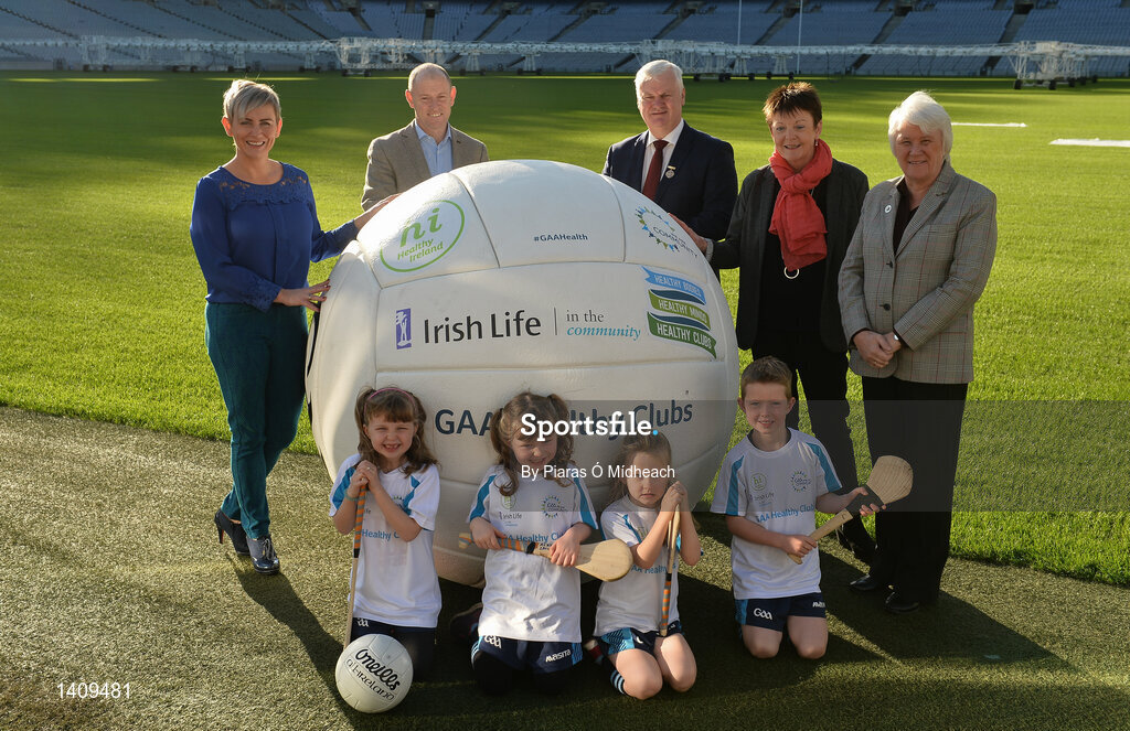 4 November 2017; In attendance at the GAA Healthy Clubs Recognition Event, supported by Irish Life, which saw 58 GAA clubs recognised as the first official ‘Healthy Clubs’ on the island of Ireland are, from left, Fiona Teague, Health Improvement Manager with the Public Health Agency with a regional responsibility for Mental and Emotional Well Being and Suicide Prevention, David Harney, CEO Irish Life, Uachtarán Chumann Lúthchleas Gael Aogán Ó Fearghail, Biddy O'Neill, Healthy Ireland, and Catherine Byrne, Minister of State for Health Promotion and the National Drugs Strategy, Department of Health, with children, from left, Aoibhe Lalor age 7, Alannah Lalor, age 5, Méabh McDonald, age 4, and Conor McDonald, age 6, all from the St Colmcilles Healthy Club in Meath. The GAA’s Healthy Clubs Project hopes to transform GAA clubs nationally into hubs for community health and wellbeing. As part of the programme, each club is trained to deliver advice and information programmes on a variety of different topics including, physical activity; emotional wellbeing; healthy eating; community development, to name but a few. For more information, visit: www.gaa.ie/community. Croke Park, Dublin. Photo by Piaras Ó Mídheach/Sportsfile