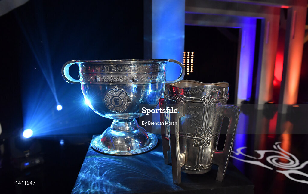 3 November 2017; A general view of the Sam Maguire and Liam MacCarthy cups during the PwC All Stars 2017 at the Convention Centre in Dublin. Photo by Brendan Moran/Sportsfile