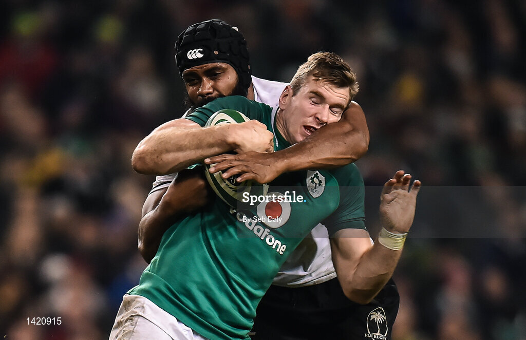18 November 2017; Chris Farrell of Ireland is tackled by Dominiko Waqaniburotu of Fiji during the Guinness Series International match between Ireland and Fiji at the Aviva Stadium in Dublin. Photo by Seb Daly/Sportsfile