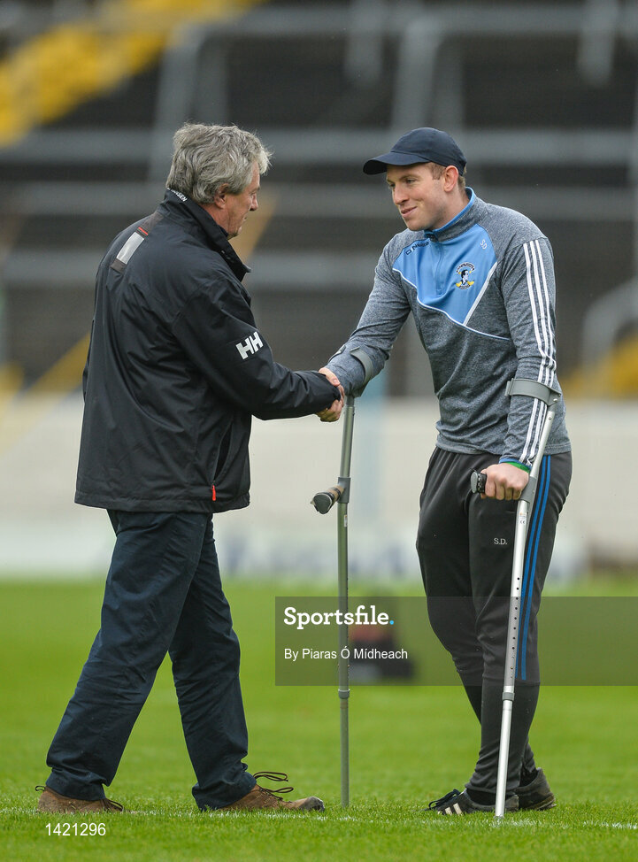 19 November 2017; Injured Na Piarsaigh player Shane Dowling with Doctor Tadhg O'Sullivan, who treated Dowling, and whose sons David, Tim, Barry and Brian are in the Ballygunner squad, before the AIB Munster GAA Hurling Senior Club Championship Final match between Na Piarsaigh and Ballygunner at Semple Stadium in Thurles, Co Tipperary. Photo by Piaras Ó Mídheach/Sportsfile