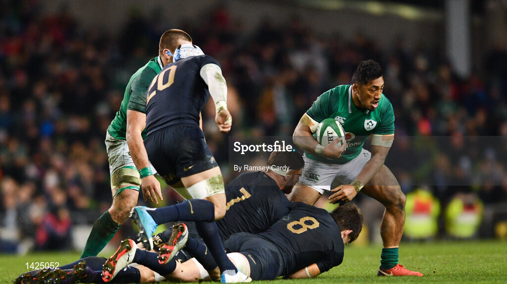 25 November 2017; Bundee Aki of Ireland is tackled by Marcos Kremer, left, and Tomas Lezana of Argentina during the Guinness Series International match between Ireland and Argentina at the Aviva Stadium in Dublin. Photo by Ramsey Cardy/Sportsfile