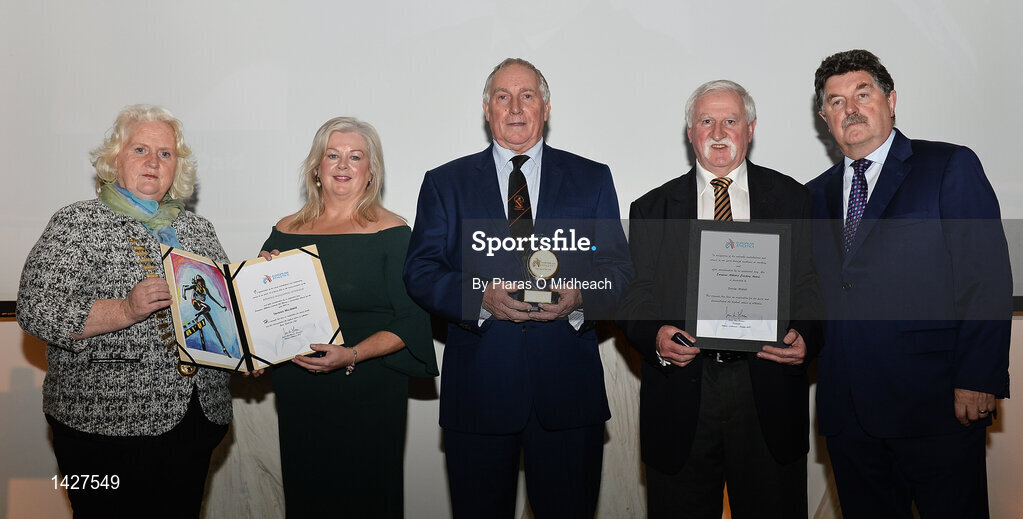 6 December 2017; Georgina Drumm, President of Athletics Ireland, left, and John Foley, CEO, Athletics Ireland, with European Awards winners, from left, Teresa McDaid, Paddy Marley and Donie Walsh during the Irish Life Health National Athletics Awards 2017 at Crowne Plaza in Santry, Dublin. Photo by Piaras Ó Mídheach/Sportsfile