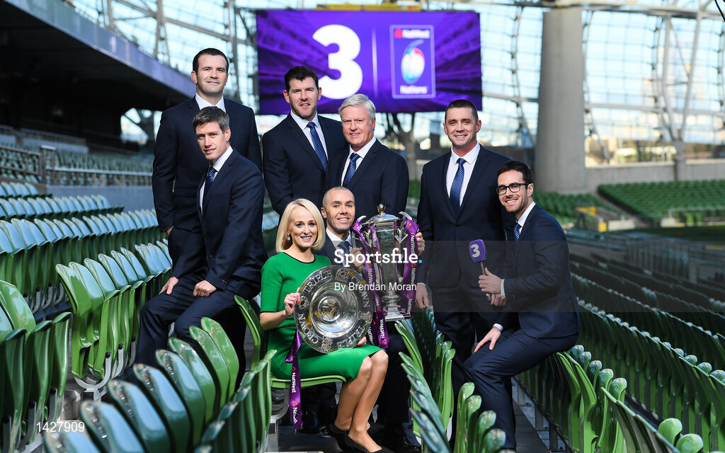 8 December 2017; TV3 announced it's presentation team and panel for it's coverage of the NatWest Six Nations 2018. The presentation team will be anchored by Joe Molloy. TV3’s panellists will include Ronan O’Gara, Shane Horgan, Shane Jennings and Matt Williams. Alan Quinlan will join Dave McIntyre as part of the commentary team. TV3 holds the exclusive rights to the NatWest Six Nations for the next four years. At a launch event held in the Aviva Stadium when TV3 introduced the presentation team and panel for its exclusive coverage of the NatWest Six Nations 2018, are clockwise, from left, Ronan O'Gara, Shane Jennings, Shane Horgan, Matt Williams, Alan Quinlan, presenter Joe Molloy, commentator Dave McIntyre, and pitchside reporter Sinead Kissane. Photo by Brendan Moran/Sportsfile