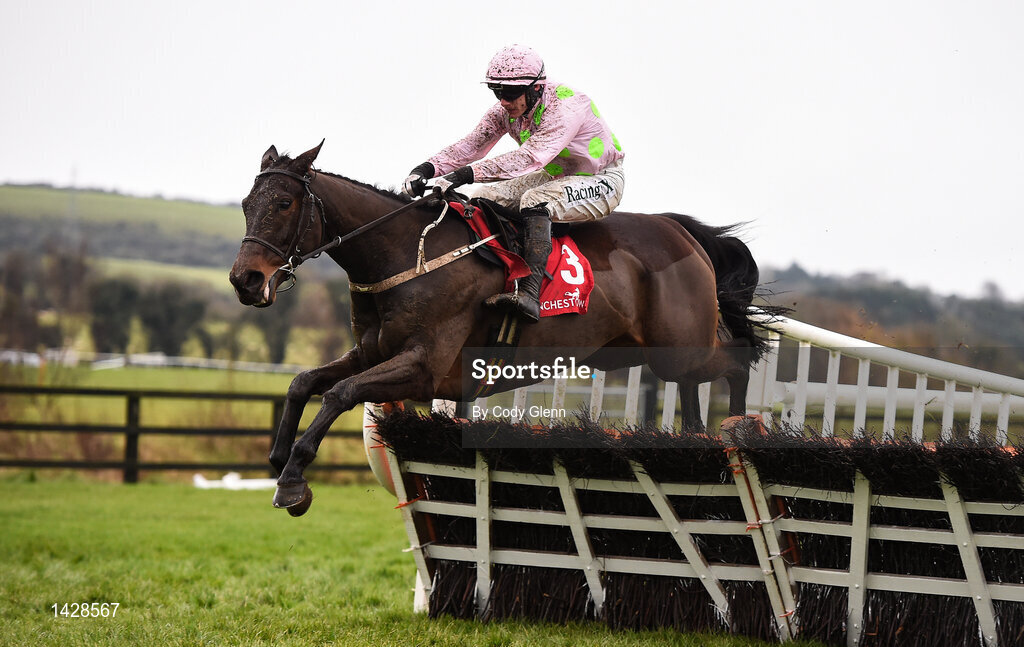 10 December 2017; Getabird, with Paul Townend up, jump the last on their way to winning the Corinthian Restaurant On Sale Now Maiden Hurdle at Punchestown Racecourse in Naas, Co Kildare. Photo by Cody Glenn/Sportsfile