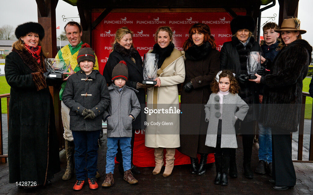 10 December 2017; Members of the Durkan family join trainer Jessica Harrington, third from right, and jockey Robbie Power, second from left, after their win in the John Durkan Memorial Punchestown Steeplechase (Grade 1) with horse Sizing John at Punchestown Racecourse in Naas, Co Kildare. Photo by Cody Glenn/Sportsfile