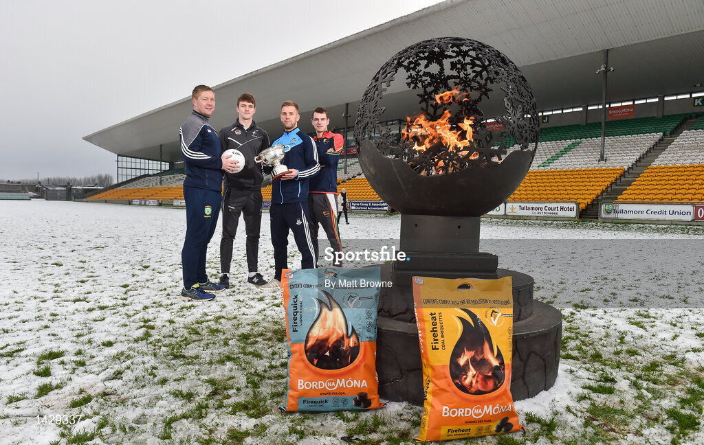12 December 2017; Jonny Cooper of Dublin with, from left, Alan Mulhall of Offaly, Kevin Feely of Kildare, and Sean Gannon of Carlow at the launch of the Bord na Móna Leinster GAA series at Bord na Móna O'Connor Park, Tullamore, Co Offaly. The Bord na Móna Leinster Series comprises of the Bord na Móna O’Byrne Cup, Bord na Móna Walsh Cup and the Bord na Móna Kehoe Cup. Photo by Matt Browne/Sportsfile