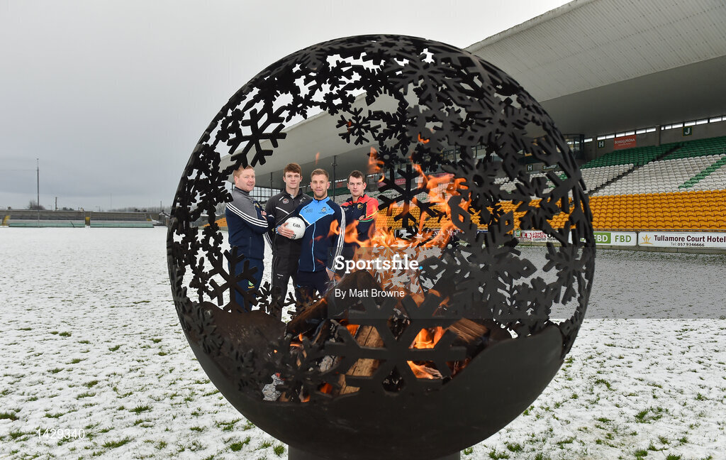 12 December 2017; Jonny Cooper of Dublin with, from left, Alan Mulhall of Offaly, Kevin Feely of Kildare, and Sean Gannon of Carlow at the launch of the Bord na Móna Leinster GAA series at Bord na Móna O'Connor Park, Tullamore, Co Offaly. The Bord na Móna Leinster Series comprises of the Bord na Móna O’Byrne Cup, Bord na Móna Walsh Cup and the Bord na Móna Kehoe Cup. Photo by Matt Browne/Sportsfile
