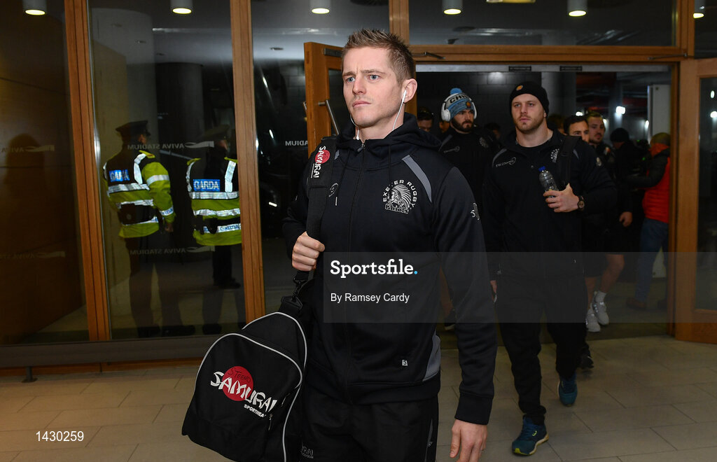 16 December 2017; Gareth Steenson of Exeter Chiefs arrives ahead of the European Rugby Champions Cup Pool 3 Round 4 match between Leinster and Exeter Chiefs at the Aviva Stadium in Dublin. Photo by Ramsey Cardy/Sportsfile