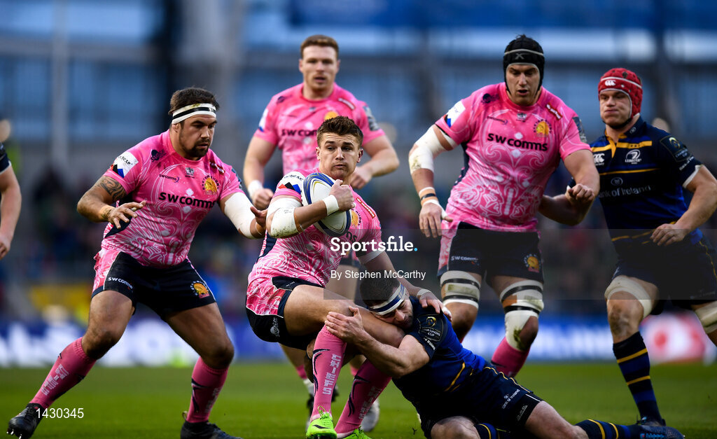 16 December 2017; Henry Slade of Exeter Chiefs is tackled by Fergus McFadden of Leinster during the European Rugby Champions Cup Pool 3 Round 4 match between Leinster and Exeter Chiefs at the Aviva Stadium in Dublin. Photo by Stephen McCarthy/Sportsfile