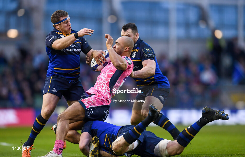 16 December 2017; Olly Woodburn of Exeter Chiefs is tackled by Leinster players, from left, Sean Cronin, Jack Conan and Cian Healy during the European Rugby Champions Cup Pool 3 Round 4 match between Leinster and Exeter Chiefs at the Aviva Stadium in Dublin. Photo by Stephen McCarthy/Sportsfile
