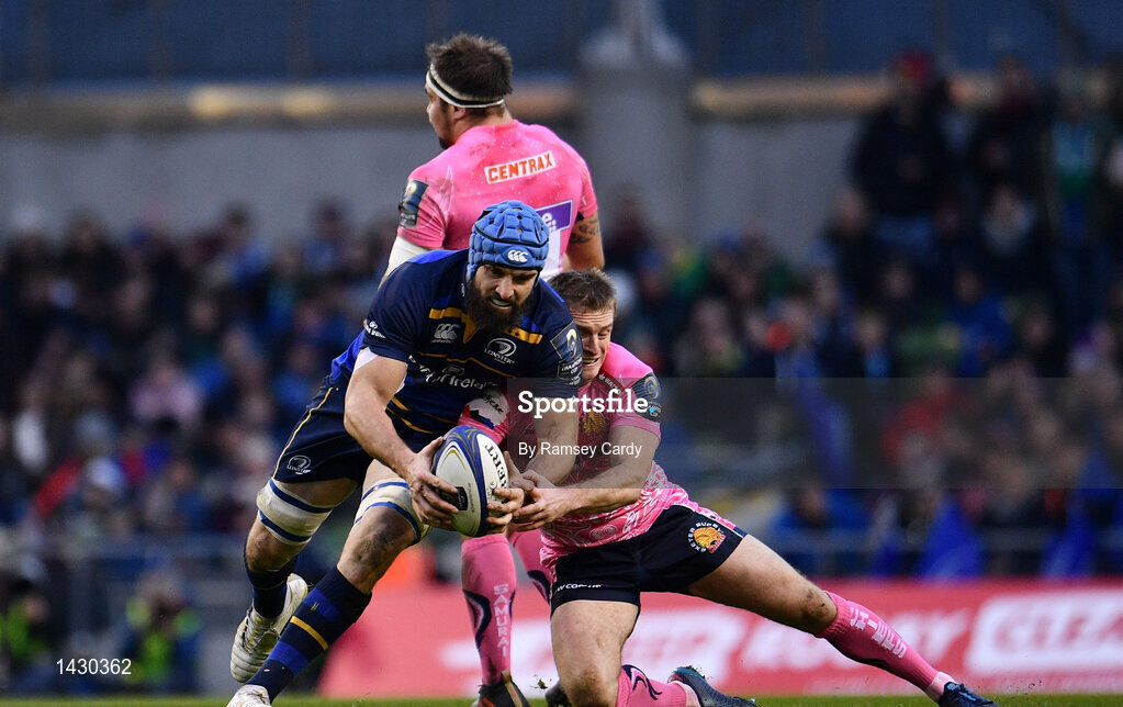 16 December 2017; Scott Fardy of Leinster is tackled by Gareth Steenson of Exeter Chiefs during the European Rugby Champions Cup Pool 3 Round 4 match between Leinster and Exeter Chiefs at the Aviva Stadium in Dublin. Photo by Ramsey Cardy/Sportsfile