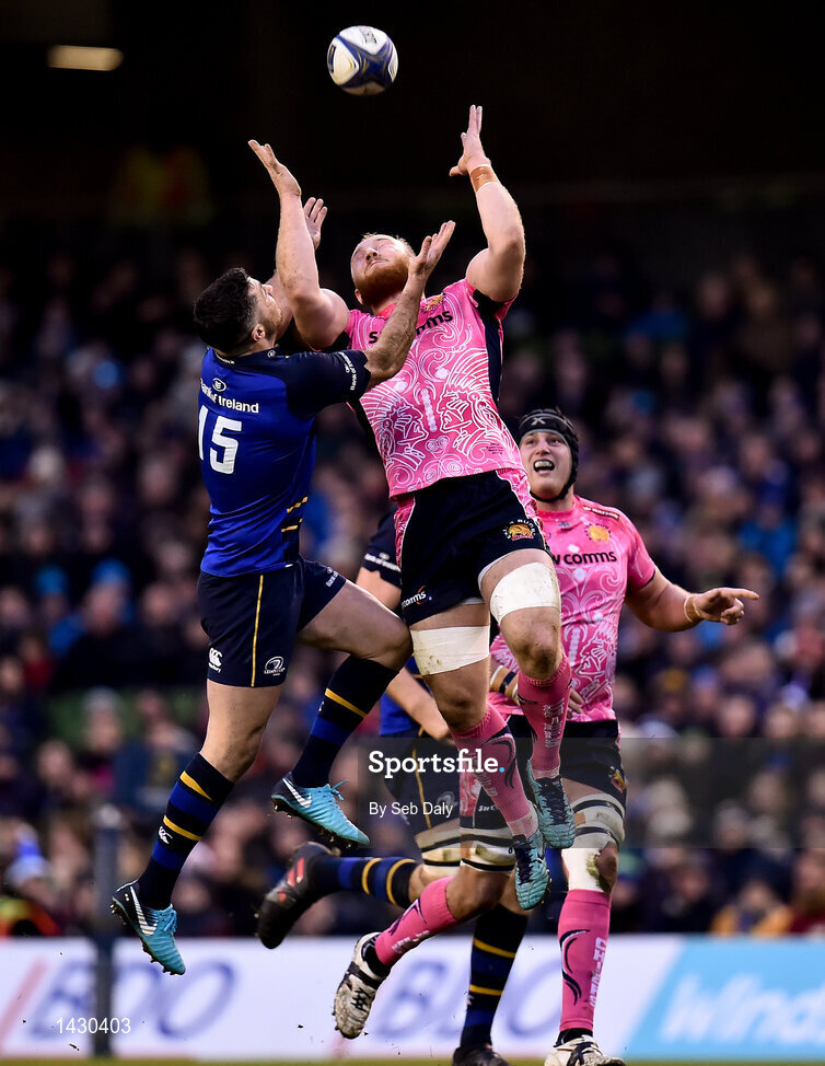 16 December 2017; Rob Kearney of Leinster in action against Matt Kvesic of Exeter Chiefs during the European Rugby Champions Cup Pool 3 Round 4 match between Leinster and Exeter Chiefs at the Aviva Stadium in Dublin. Photo by Seb Daly/Sportsfile