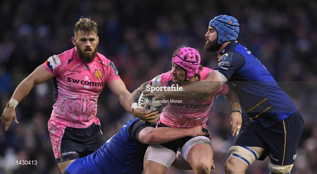 16 December 2017; Jack Nowell of Exeter Chiefs is tackled by Tadhg Furlong and Scott Fardy of Leinster during the European Rugby Champions Cup Pool 3 Round 4 match between Leinster and Exeter Chiefs at the Aviva Stadium in Dublin. Photo by Brendan Moran/Sportsfile
