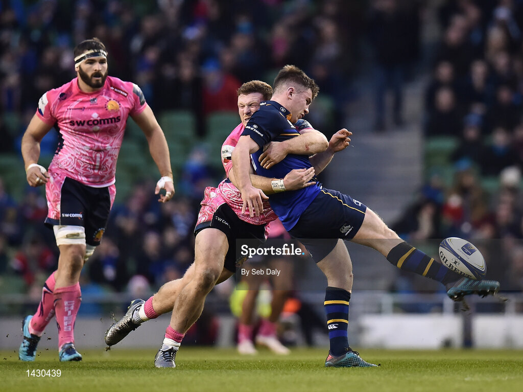 16 December 2017; Luke McGrath of Leinster is tackled by Sam Simmonds of Exeter Chiefs during the European Rugby Champions Cup Pool 3 Round 4 match between Leinster and Exeter Chiefs at the Aviva Stadium in Dublin. Photo by Seb Daly/Sportsfile