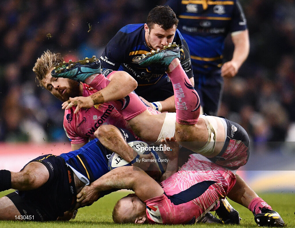 16 December 2017; Fergus McFadden of Leinster is tackled by Matt Kvesic of Exeter Chiefs during the European Rugby Champions Cup Pool 3 Round 4 match between Leinster and Exeter Chiefs at the Aviva Stadium in Dublin. Photo by Ramsey Cardy/Sportsfile