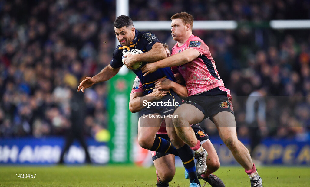 16 December 2017; Rob Kearney of Leinster is tackled by Tomas Francis, behind, and Sam Simmonds of Exeter Chiefs during the European Rugby Champions Cup Pool 3 Round 4 match between Leinster and Exeter Chiefs at the Aviva Stadium in Dublin. Photo by Brendan Moran/Sportsfile