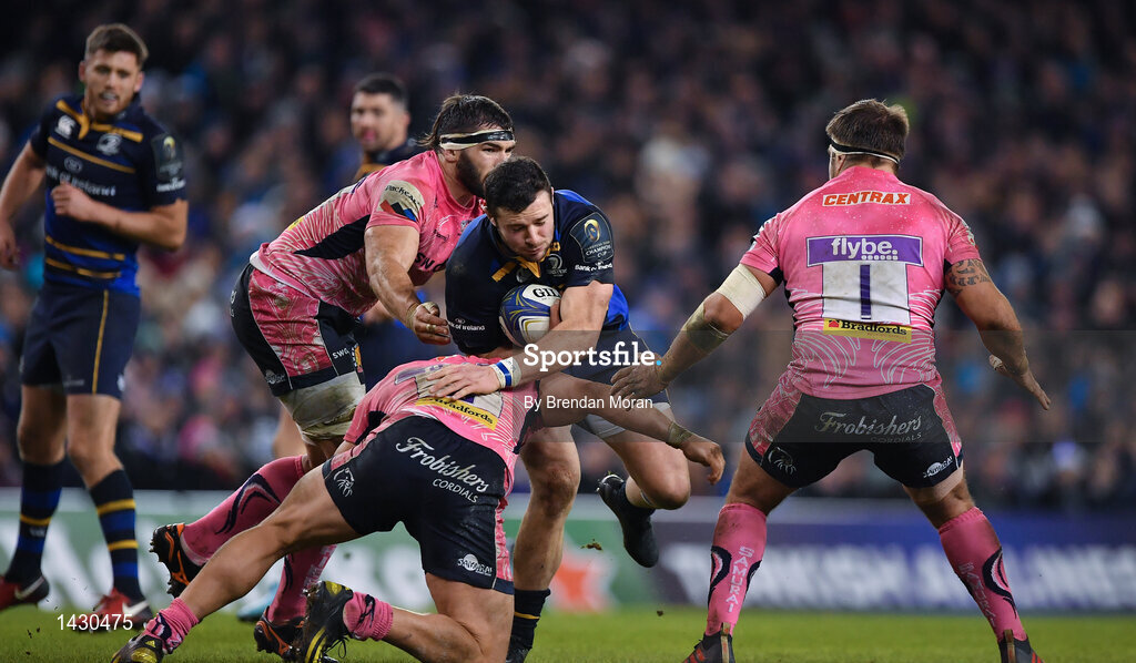 16 December 2017; Robbie Henshaw of Leinster is tackled by Don Armand, Luke Cowan-Dickie and Ben Moon of Exeter Chiefs during the European Rugby Champions Cup Pool 3 Round 4 match between Leinster and Exeter Chiefs at the Aviva Stadium in Dublin. Photo by Brendan Moran/Sportsfile