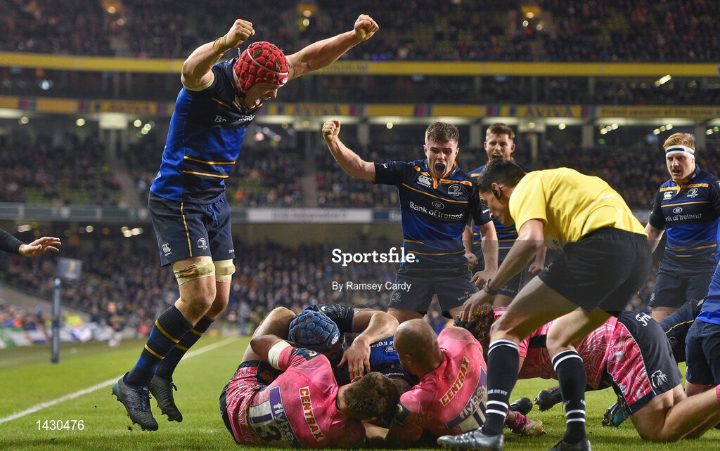 16 December 2017; Josh van der Flier of Leinster celebrates a try by Fergus McFadden, hidden, which was disallowed during the European Rugby Champions Cup Pool 3 Round 4 match between Leinster and Exeter Chiefs at the Aviva Stadium in Dublin. Photo by Ramsey Cardy/Sportsfile