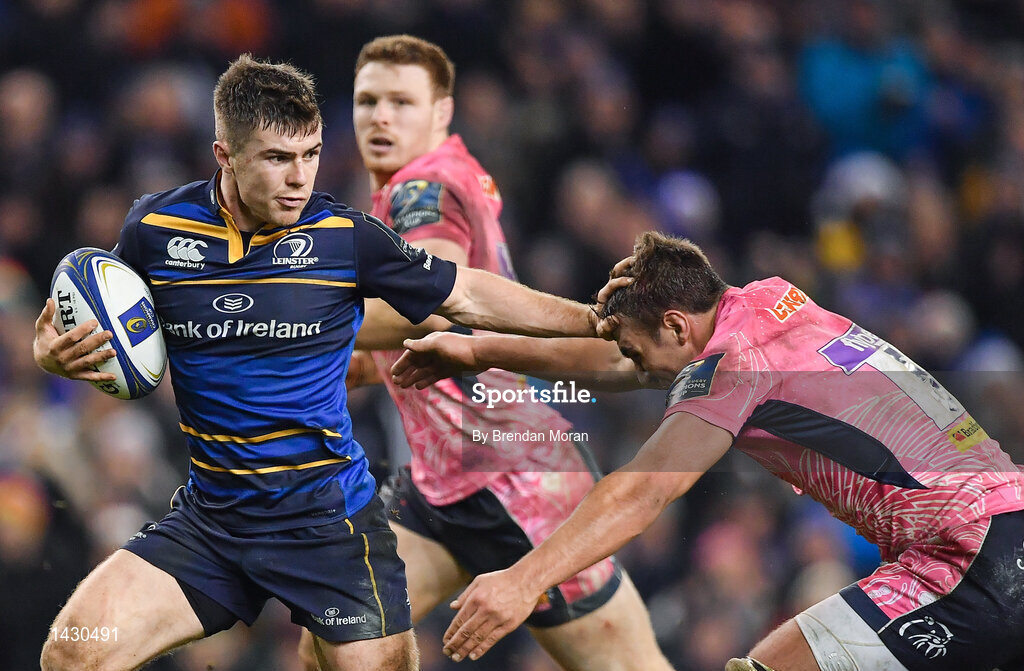 16 December 2017; Luke McGrath of Leinster breaks away from Sam Skinner of Exeter Chiefs on the way to scoring to his side's first try during the European Rugby Champions Cup Pool 3 Round 4 match between Leinster and Exeter Chiefs at the Aviva Stadium in Dublin. Photo by Brendan Moran/Sportsfile