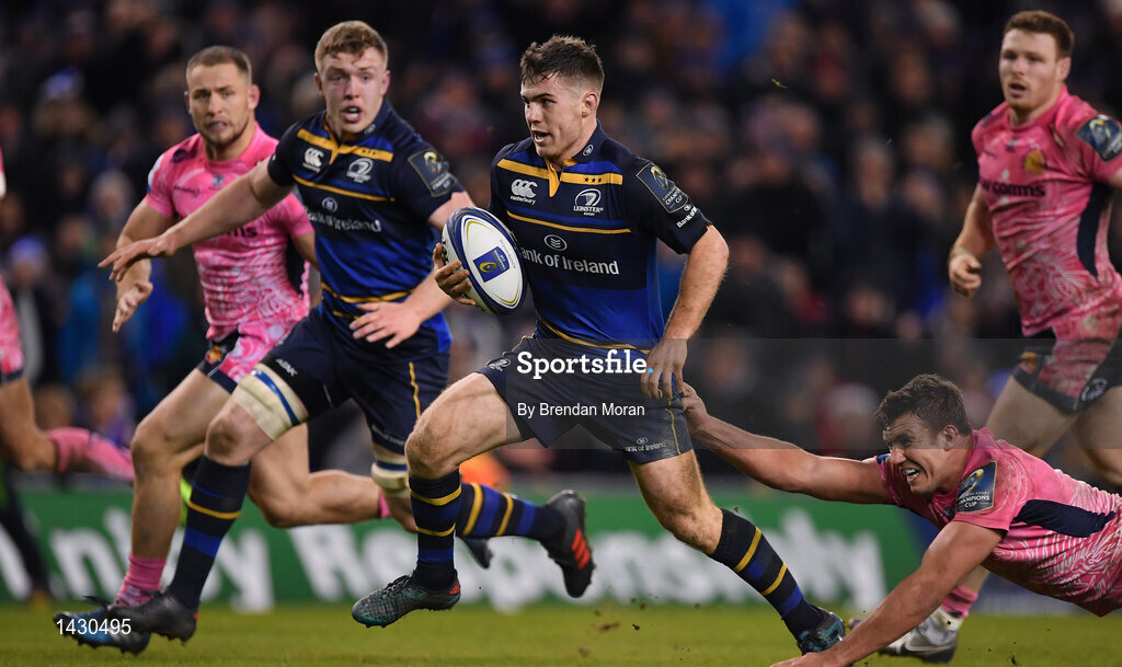 16 December 2017; Luke McGrath of Leinster breaks away from Sam Skinner of Exeter Chiefs on the way to scoring to his side's first try, after a pass from team-mate Dan Leavy, left, during the European Rugby Champions Cup Pool 3 Round 4 match between Leinster and Exeter Chiefs at the Aviva Stadium in Dublin. Photo by Brendan Moran/Sportsfile