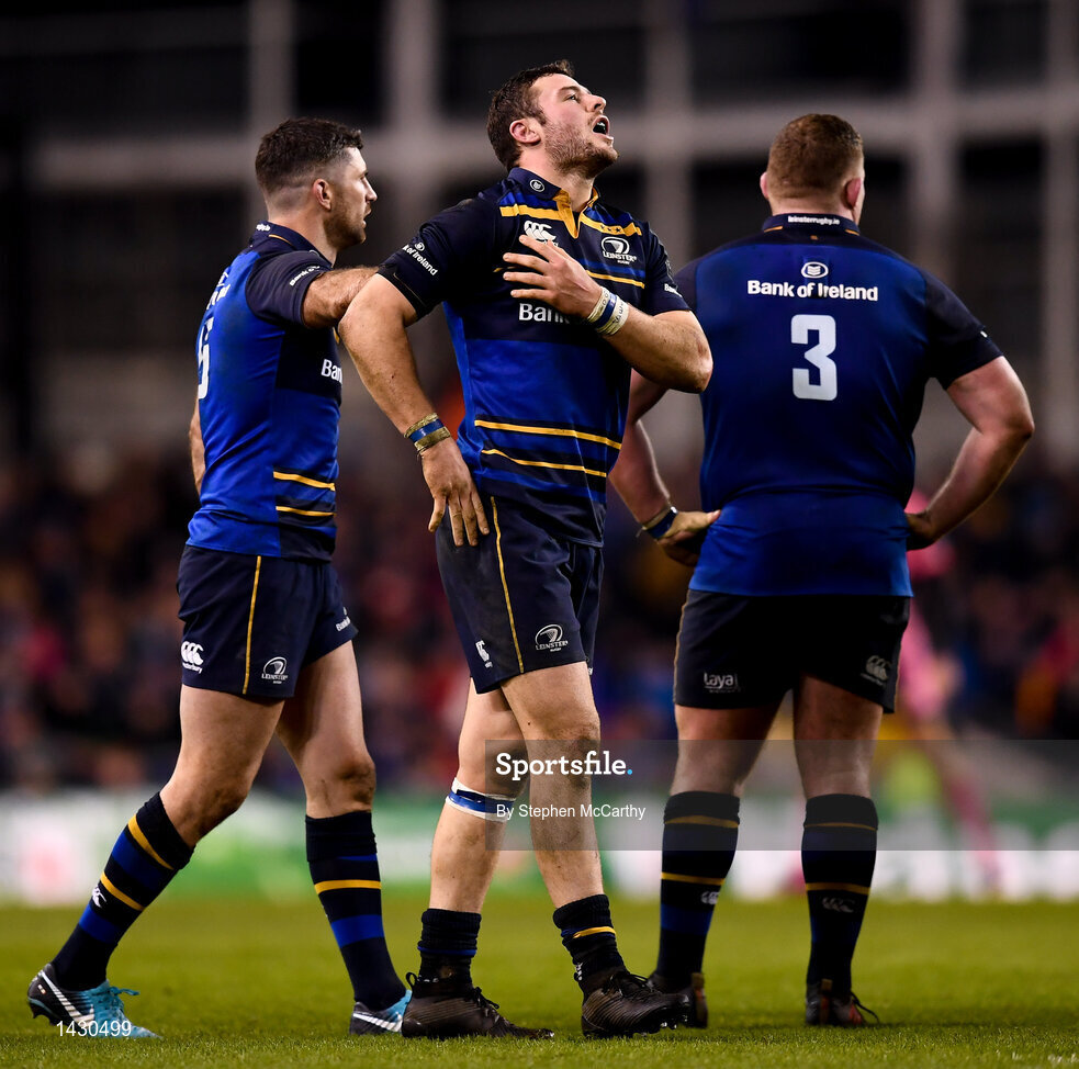 16 December 2017; Robbie Henshaw of Leinster reacts after picking up a knock during the European Rugby Champions Cup Pool 3 Round 4 match between Leinster and Exeter Chiefs at the Aviva Stadium in Dublin. Photo by Stephen McCarthy/Sportsfile