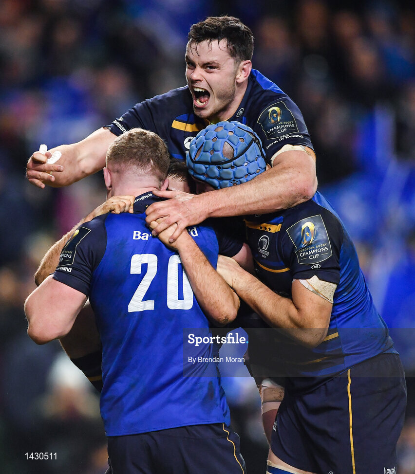 16 December 2017; James Ryan of Leinster celebrates with team-mates Dan Leavy, Scott Fardy and try scorer Luke McGrath after their side's first try during the European Rugby Champions Cup Pool 3 Round 4 match between Leinster and Exeter Chiefs at the Aviva Stadium in Dublin. Photo by Brendan Moran/Sportsfile