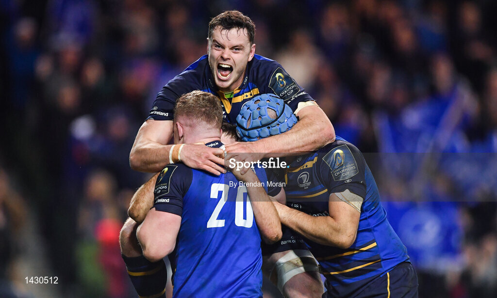 16 December 2017; James Ryan of Leinster celebrates with team-mates Dan Leavy, Scott Fardy and try scorer Luke McGrath after their side's first try during the European Rugby Champions Cup Pool 3 Round 4 match between Leinster and Exeter Chiefs at the Aviva Stadium in Dublin. Photo by Brendan Moran/Sportsfile