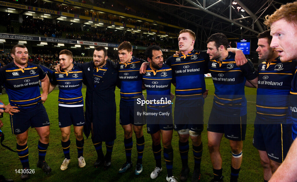 16 December 2017; Leinster players, from left, Jack McGrath, Jordan Larmour, Cian Healy, Garry Ringrose, Isa Nacewa, Dan Leavy, Robbie Henshaw, Fergus McFadden and James Tracy following their victory in the European Rugby Champions Cup Pool 3 Round 4 match between Leinster and Exeter Chiefs at the Aviva Stadium in Dublin. Photo by Ramsey Cardy/Sportsfile
