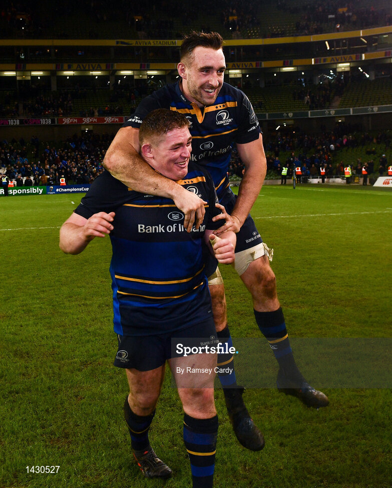 16 December 2017; Tadhg Furlong, left, and Jack Conan of Leinster celebrate their victory following the European Rugby Champions Cup Pool 3 Round 4 match between Leinster and Exeter Chiefs at the Aviva Stadium in Dublin. Photo by Ramsey Cardy/Sportsfile