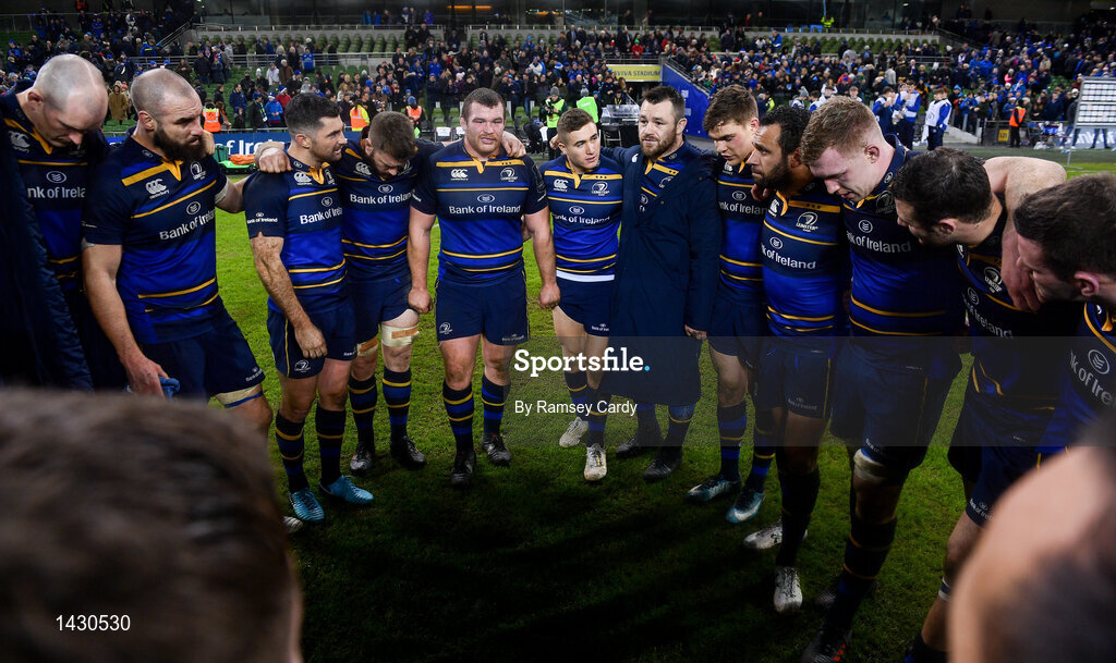 16 December 2017; Leinster players, from left, Devin Toner, Scott Fardy, Rob Kearney, Sean O'Brien, Jack McGrath, Jordan Larmour, Cian Healy, Garry Ringrose, Isa Nacewa, Dan Leavy and Robbie Henshaw following their victory in the European Rugby Champions Cup Pool 3 Round 4 match between Leinster and Exeter Chiefs at the Aviva Stadium in Dublin. Photo by Ramsey Cardy/Sportsfile