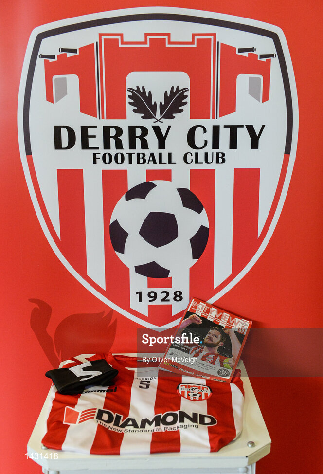 31 March 2017; A general view of a black armband and match jersey, with the number 5 in honour of their late captain Ryan McBride, that Derry City will play in tonight ahead of the side's SSE Airtricity League Premier Division match between Derry City and Bray Wanderers at Maginn Park in Buncrana, Co. Donegal. Photo by Oliver McVeigh/Sportsfile