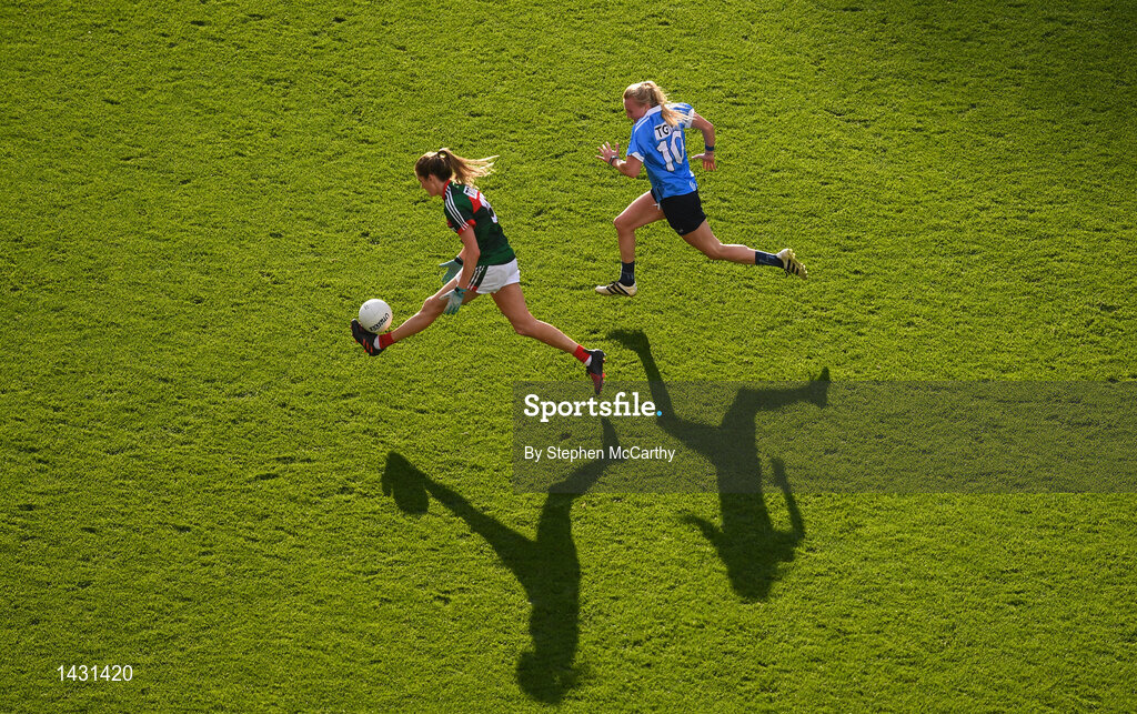 24 September 2017; Grace Kelly of Mayo in action against Carla Rowe of Dublin during the TG4 Ladies Football All-Ireland Senior Championship Final match between Dublin and Mayo at Croke Park in Dublin. Photo by Stephen McCarthy/Sportsfile