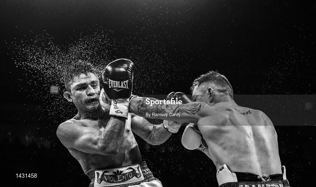 18 November 2017; (EDITOR'S NOTE: Image has been converted to black & white) Carl Frampton, right, in action against Horacio Garcia during their featherweight bout at the SSE Arena in Belfast. Photo by Ramsey Cardy/Sportsfile