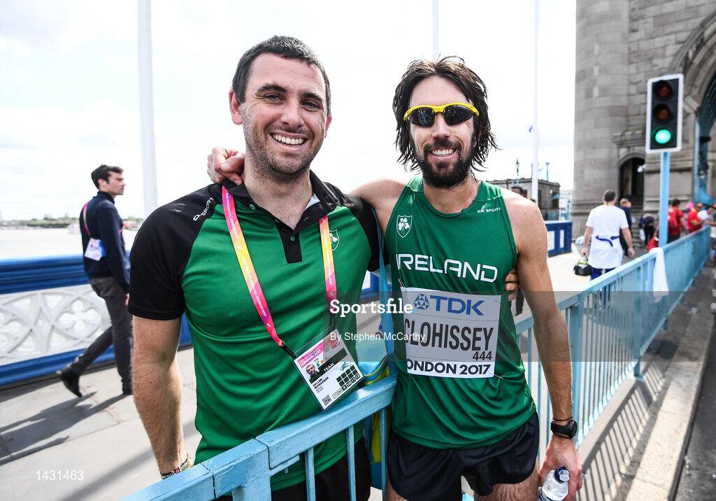 6 August 2017; Mick Clohissey of Ireland with Team Physiotherapist Declan Monaghan following the Men's Marathon event during day three of the 16th IAAF World Athletics Championships at Tower Bridge in London, England. Photo by Stephen McCarthy/Sportsfile