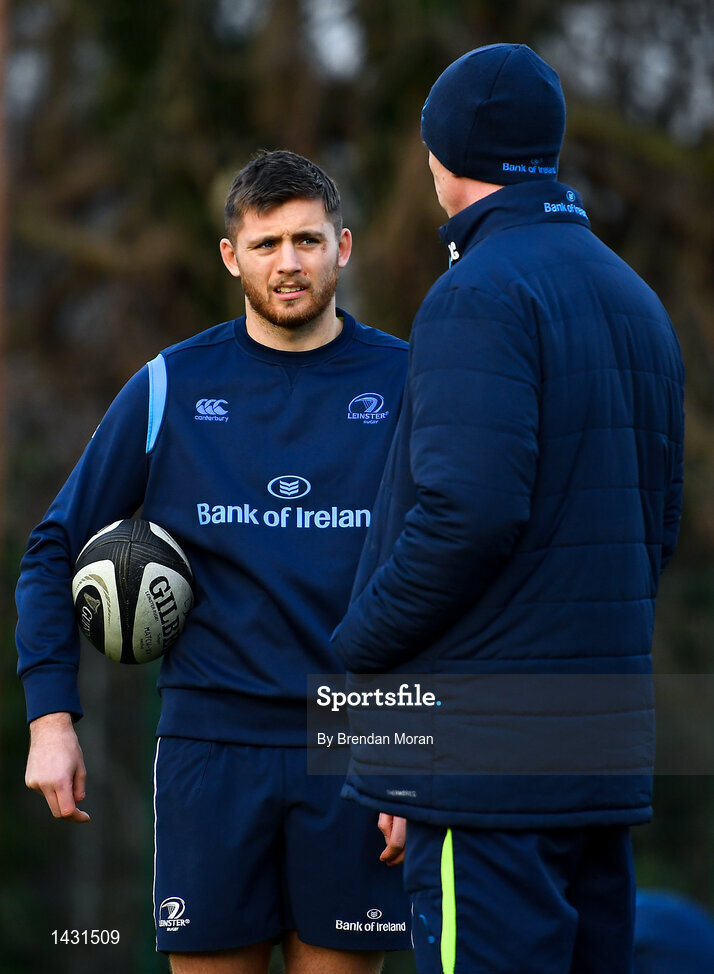 19 December 2017; Ross Byrne, left, with head coach Leo Cullen during Leinster rugby squad training at UCD in Dublin. Photo by Brendan Moran/Sportsfile