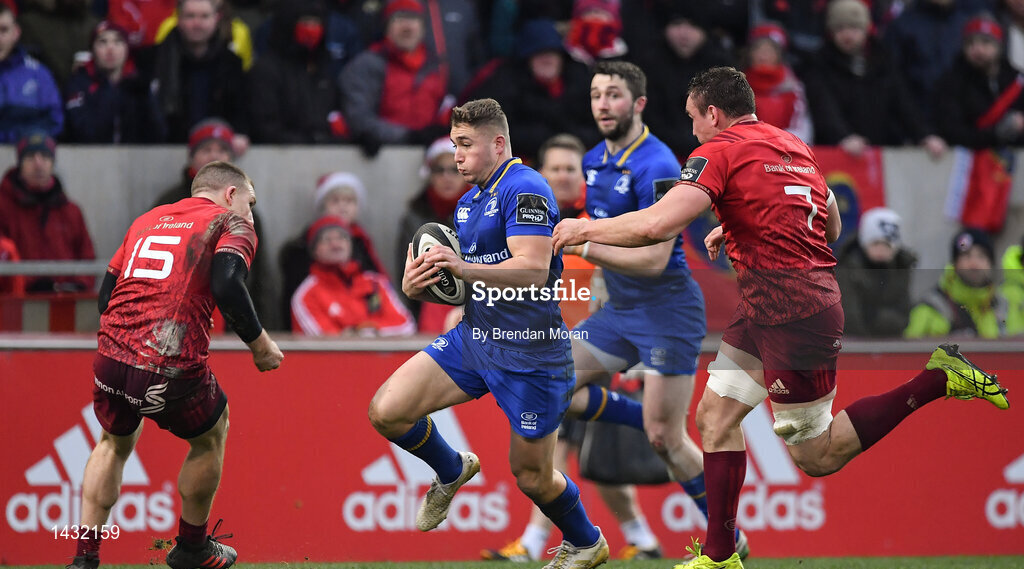26 December 2017; Jordan Larmour of Leinster in action against Andrew Conway, left, and Tommy O'Donnell of Munster during the Guinness PRO14 Round 11 match between Munster and Leinster at Thomond Park in Limerick. Photo by Brendan Moran/Sportsfile
