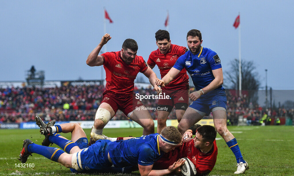 26 December 2017; Conor Murray of Munster scores his side's first try despite the tackle of Dan Leavy of Leinster during the Guinness PRO14 Round 11 match between Munster and Leinster at Thomond Park in Limerick. Photo by Ramsey Cardy/Sportsfile