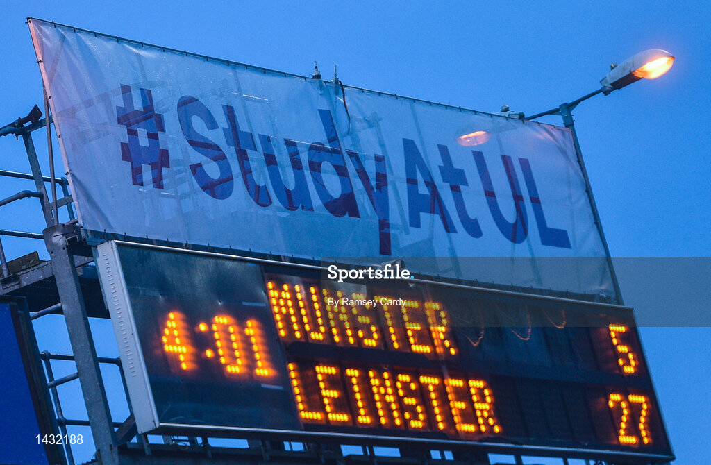 26 December 2017; A general view of the half time scoreboard during the Guinness PRO14 Round 11 match between Munster and Leinster at Thomond Park in Limerick. Photo by Ramsey Cardy/Sportsfile