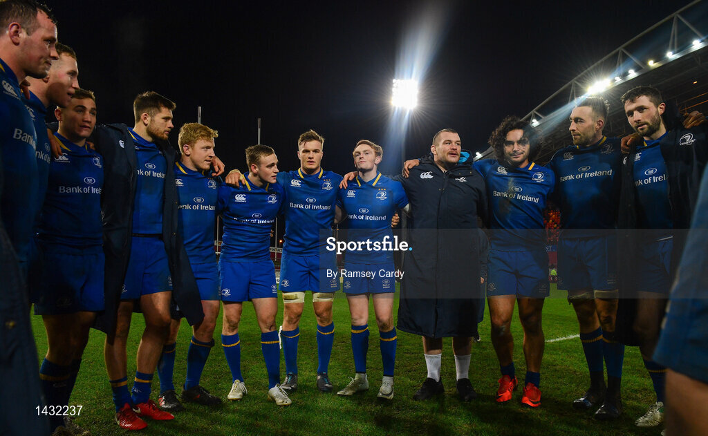 26 December 2017; The Leinster team, from left, Ed Byrne, Rory O'Loughlin, Jordan Larmour, Ross Byrne, James Tracy, Nick McCarthy, Josh van der Flier, Cathal Marsh, Jack McGrath, James Lowe, Jack Conan and Barry Daly huddle following the Guinness PRO14 Round 11 match between Munster and Leinster at Thomond Park in Limerick. Photo by Ramsey Cardy/Sportsfile