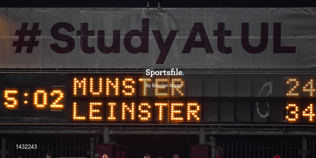26 December 2017; /The final score is shown on the scoreboard after the Guinness PRO14 Round 11 match between Munster and Leinster at Thomond Park in Limerick. Photo by Brendan Moran/Sportsfile