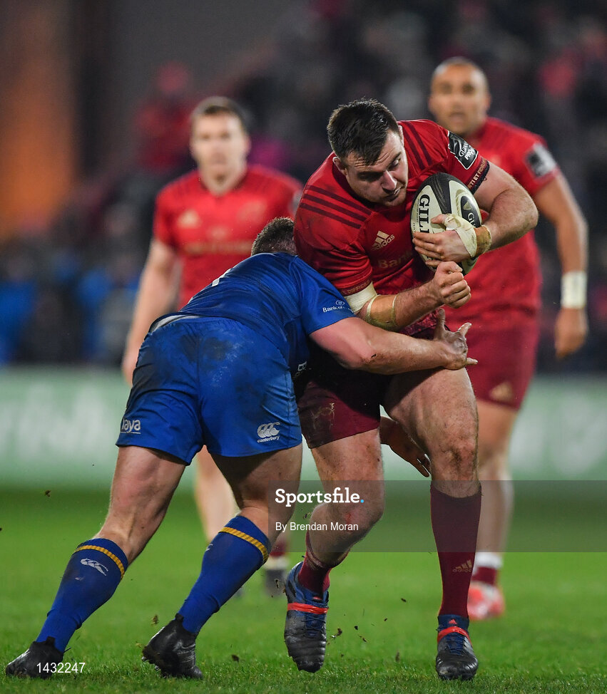 26 December 2017; Niall Scannell of Munster is tackled by Ed Byrne of Leinster during the Guinness PRO14 Round 11 match between Munster and Leinster at Thomond Park in Limerick. Photo by Brendan Moran/Sportsfile