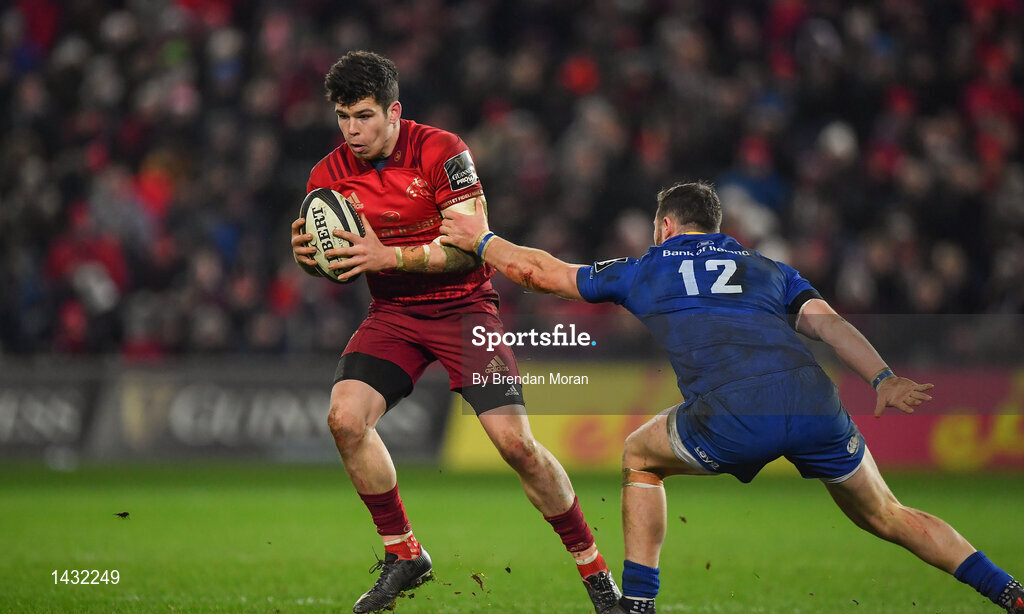 26 December 2017; Alex Wootton of Munster is tackled by Robbie Henshaw of Leinster during the Guinness PRO14 Round 11 match between Munster and Leinster at Thomond Park in Limerick. Photo by Brendan Moran/Sportsfile