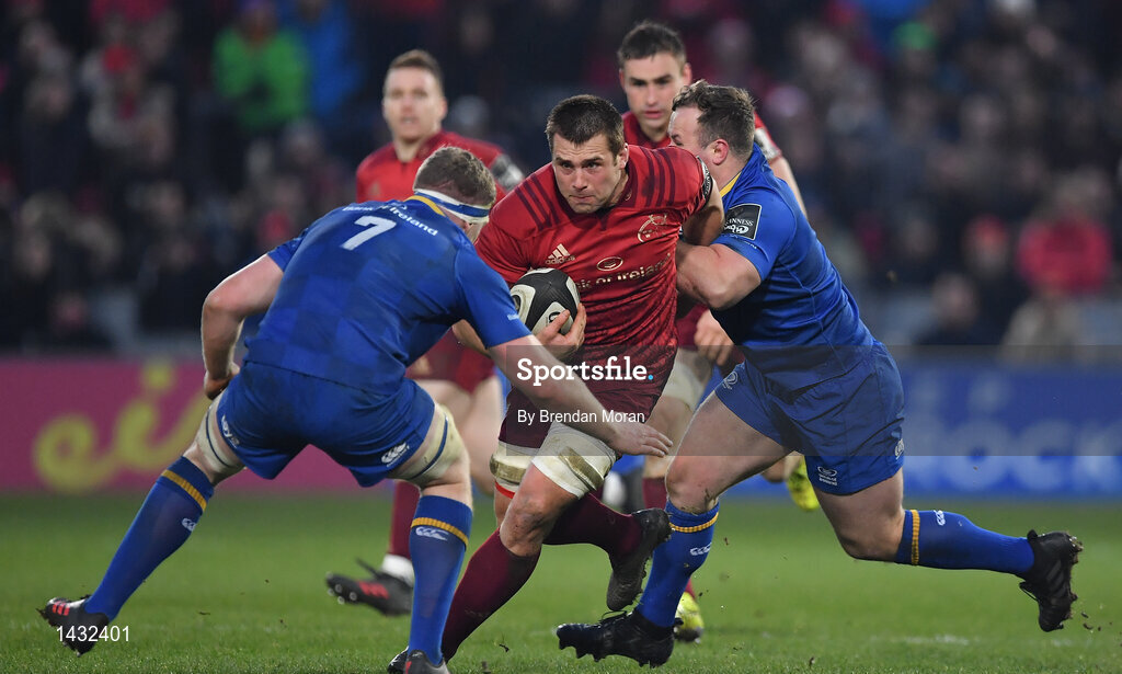 26 December 2017; CJ Stander of Munster in action against Dan Leavy, left, and Ed Byrne of Leinster during the Guinness PRO14 Round 11 match between Munster and Leinster at Thomond Park in Limerick. Photo by Brendan Moran/Sportsfile