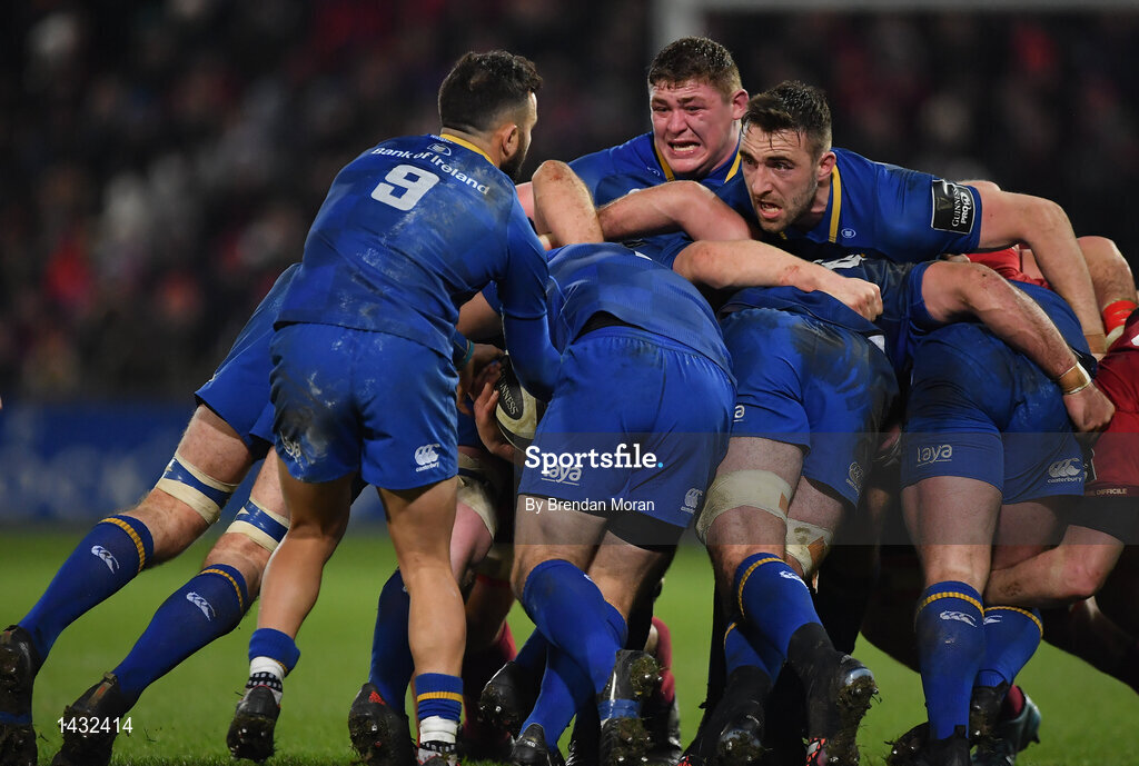 26 December 2017; Leinster scrum-half Jamison Gibson-Park takes the ball as team-mates Tadhg Furlong, centre, and Jack Conan controll a maul during the Guinness PRO14 Round 11 match between Munster and Leinster at Thomond Park in Limerick. Photo by Brendan Moran/Sportsfile