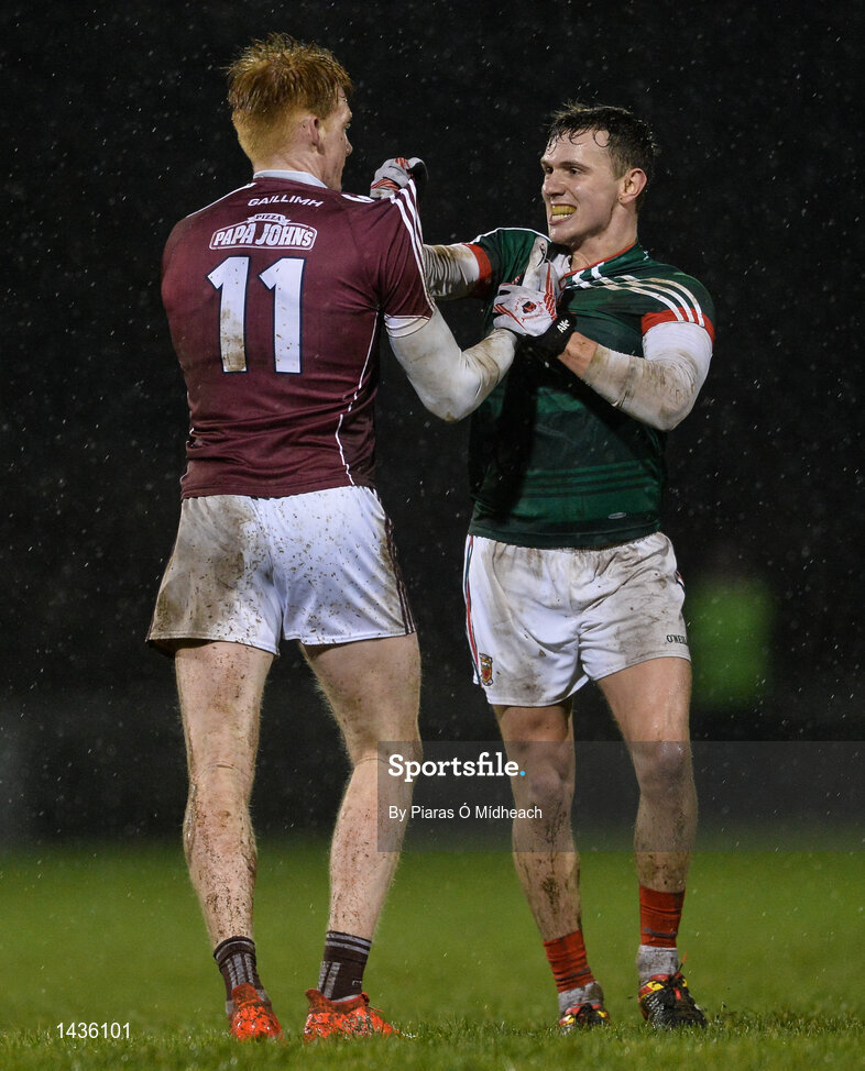 12 January 2018; Michael Plunkett of Mayo and Peter Cooke of Galway tussle during the Connacht FBD League Round 2 refixture match between Mayo and Galway at Elverys MacHale Park in Castlebar, Mayo. Photo by Piaras Ó Mídheach/Sportsfile