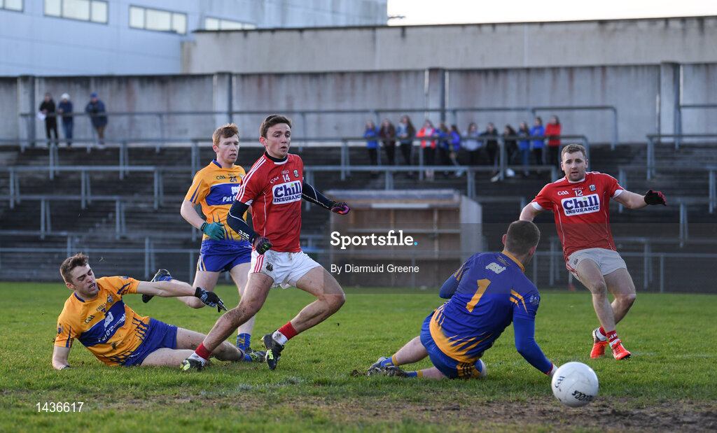13 January 2018; Mark Collins of Cork, under pressure from Cillian Brennan and Tom Hannan, scores his side's first goal past Clare goalkeeper Killlian Roche during the McGrath Cup Final between Cork and Clare at Mallow GAA Complex in Mallow, Co. Cork. Photo by Diarmuid Greene/Sportsfile