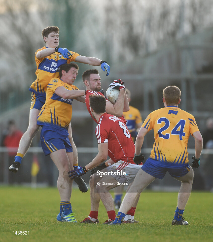 13 January 2018; Daniel O'Callaghan of Cork in action against Sean O'Donoghue and Cathal O'Connor of Clare during the McGrath Cup Final between Cork and Clare at Mallow GAA Complex in Mallow, Co. Cork. Photo by Diarmuid Greene/Sportsfile