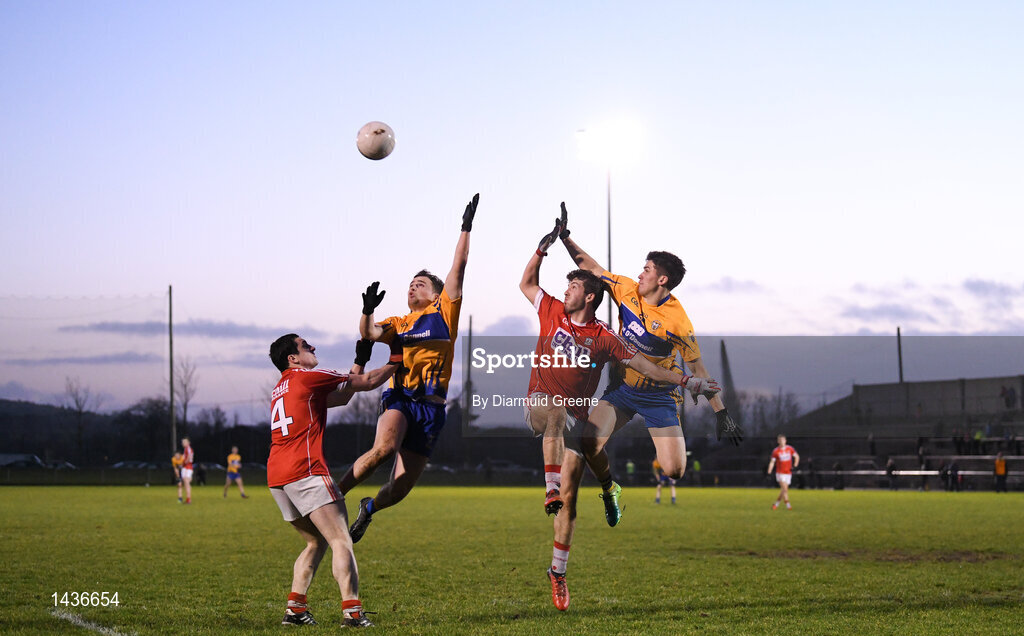 13 January 2018; Eimhin Courtney and Gearoid O'Brien of Clare in action against Michael McSweeney and Padraig Clancy of Cork during the McGrath Cup Final between Cork and Clare at Mallow GAA Complex in Mallow, Co. Cork. Photo by Diarmuid Greene/Sportsfile