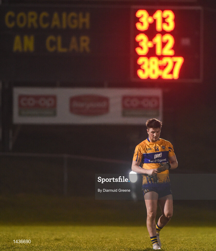 13 January 2018; The final score is displayed on the scoreboard as Keelan Sexton of Clare reacts at the final whistle after the McGrath Cup Final between Cork and Clare at Mallow GAA Complex in Mallow, Co. Cork. Photo by Diarmuid Greene/Sportsfile